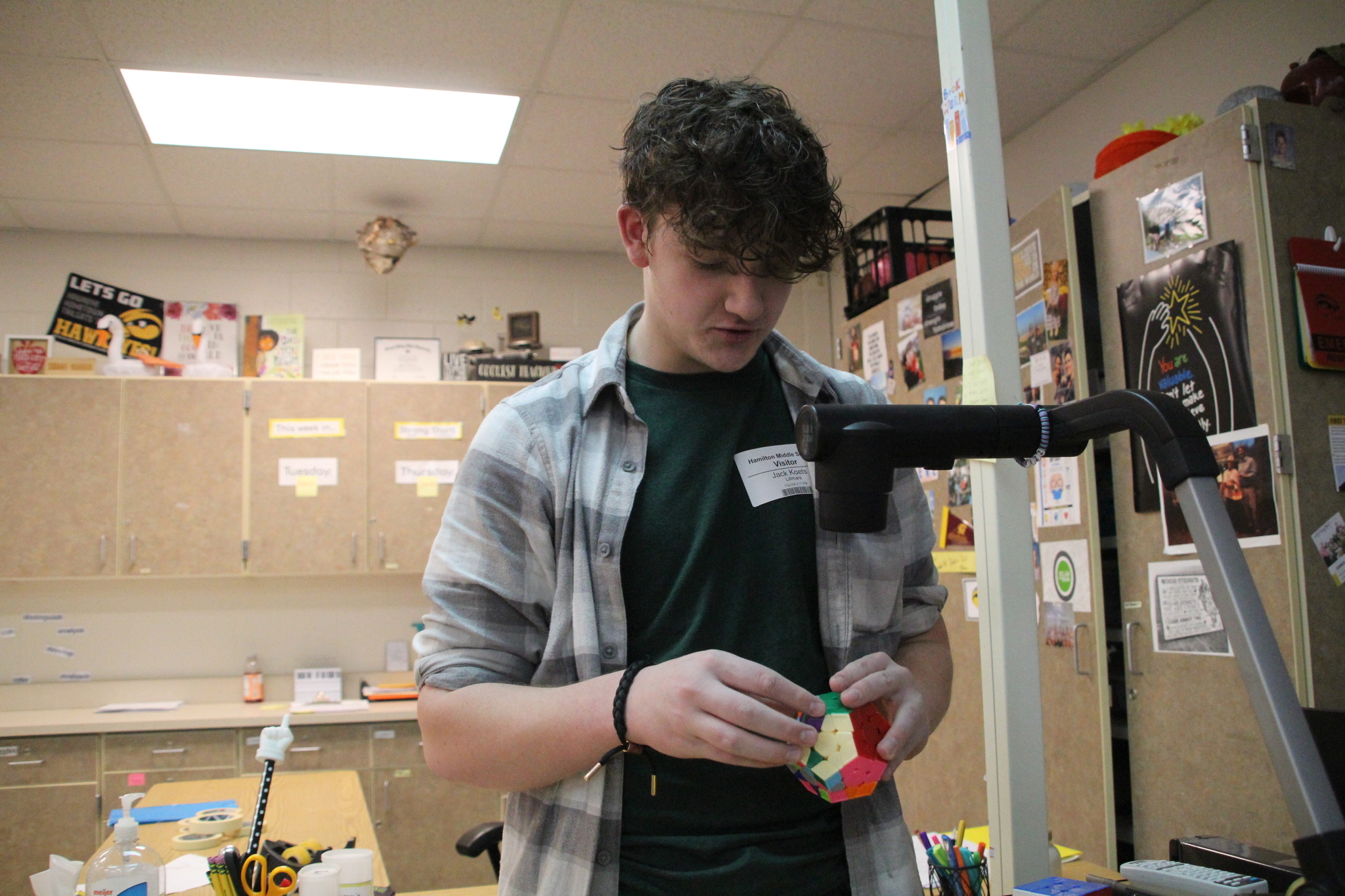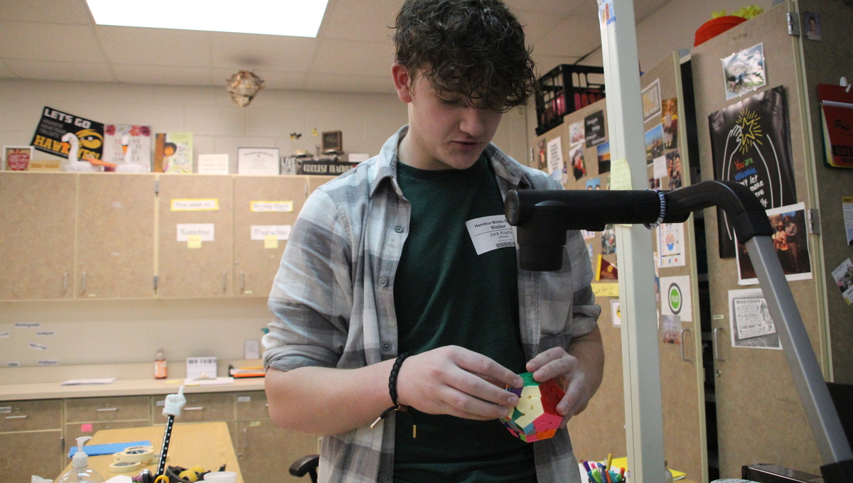 Hamilton High School senior Jack Koets is one of the fastest Rubik's cubes solvers in the entire state for his age group. This week, he wowed Ms. Lillmars and Mr. Luhmann's classes with his speed and ability - even solving a cube in just 17 seconds!